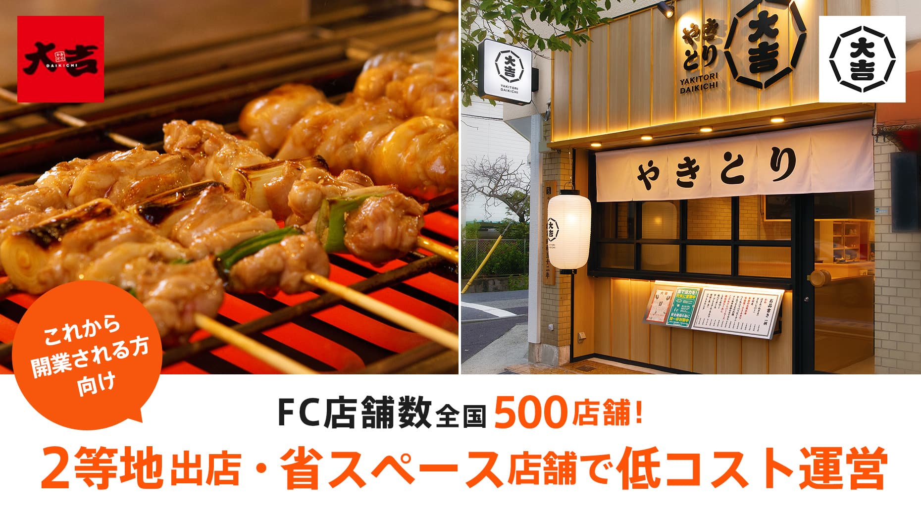 創業45年以上を誇る「やきとり大吉」は、安心価格と温かみのある店内、 店ごとに仕込みを行い、価格以上においしい焼鳥を提供することで、全国的に人気の「焼鳥専門店」です。FC加盟店は全国で約500店舗。加盟店の8割が10年以上盛業を続けています。 【戦略的立地の小型店舗】あえて駅前ではなく住宅街の入り口など周辺競合と戦わずに、永く続けていくことが出来る立地を本部が見つけ出し、10坪20席程度の小型店舗を出店。地域に根付いた経営で、不景気や感染にも負けない手堅さが魅力の焼鳥フランチャイズです。開業パッケージの仕組みにも個人の方が永く続けていくためのノウハウが詰まっています。 2022年9月“新”大吉が神戸にオープン。「赤い看板」からモダンな外観・内装に!メニューバリエーションも拡充し、より幅広いお客様に楽しんでいただけるメニュー構成へと進化しました。 【進化した大吉で永く盛業を続けていきたい方】にお薦めの実力派個人向けフランチャイズです。 ①基本パッケージ(10坪20席)の小型店舗は、末永く愛される地域密着型。小型店舗のため、運営費用も低く済むことも盛業が永く続く秘訣の一つです。 ②仕込み・調理・接客から店舗運営まで学べる3か月3店舗での実地研修が用意されているため、飲食未経験・初めての方も安心です。 ③開業後の本部へロイヤリティーは、毎月定額3.3万円のみ。儲かったら儲かった分がご本人の収入です。 ④物件調査は、本部・取引酒販店を中心に行い、大吉を安定的に経営できるご本人の希望する立地で開業していただきます。 ⑤開業後のフォロー 大吉本部は定期的に店舗状況を確認し、盛業に向けてのアドバイスを行います。 ⑥契約更新(5年)時に更新費用が不要のため、永く続けていきたいと考えている方にとってオススメの案件です!