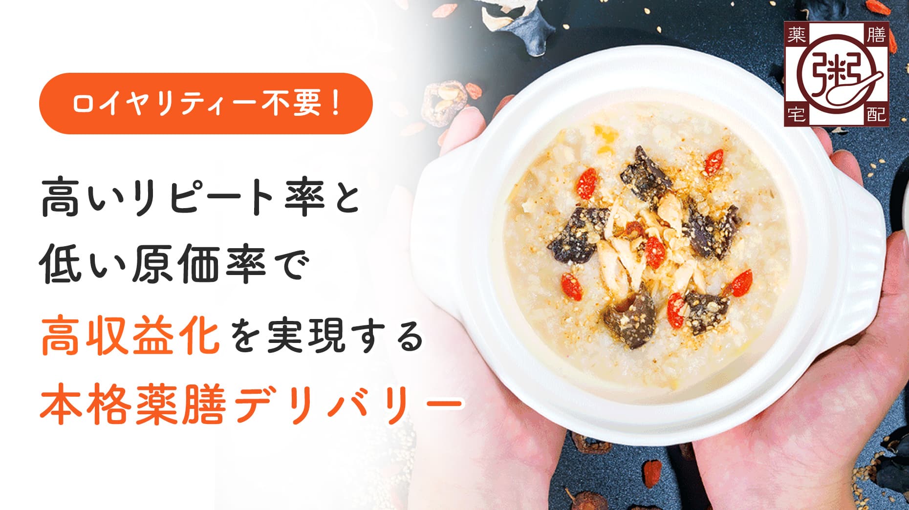 「おかゆや」は漢方薬のECを手掛ける株式会社ハーバルアイが運営する本格的な薬膳おかゆの専門店です。医食同源をテーマに、質の高い薬膳メニューを提供することで、デリバリーを中心に女性層からの高い支持率を獲得。 原価が低く、導入機材もIHコンロのみで始められるため、火を使わないことから様々な飲食店に導入を頂いております。 2019年にオープン以降、Uber Eats最高水準・厳選店舗として認定され確固たるブランディングを確立しています。また、保証金やロイヤリティーが不要のため安定した利益を得られる注目の事業です。