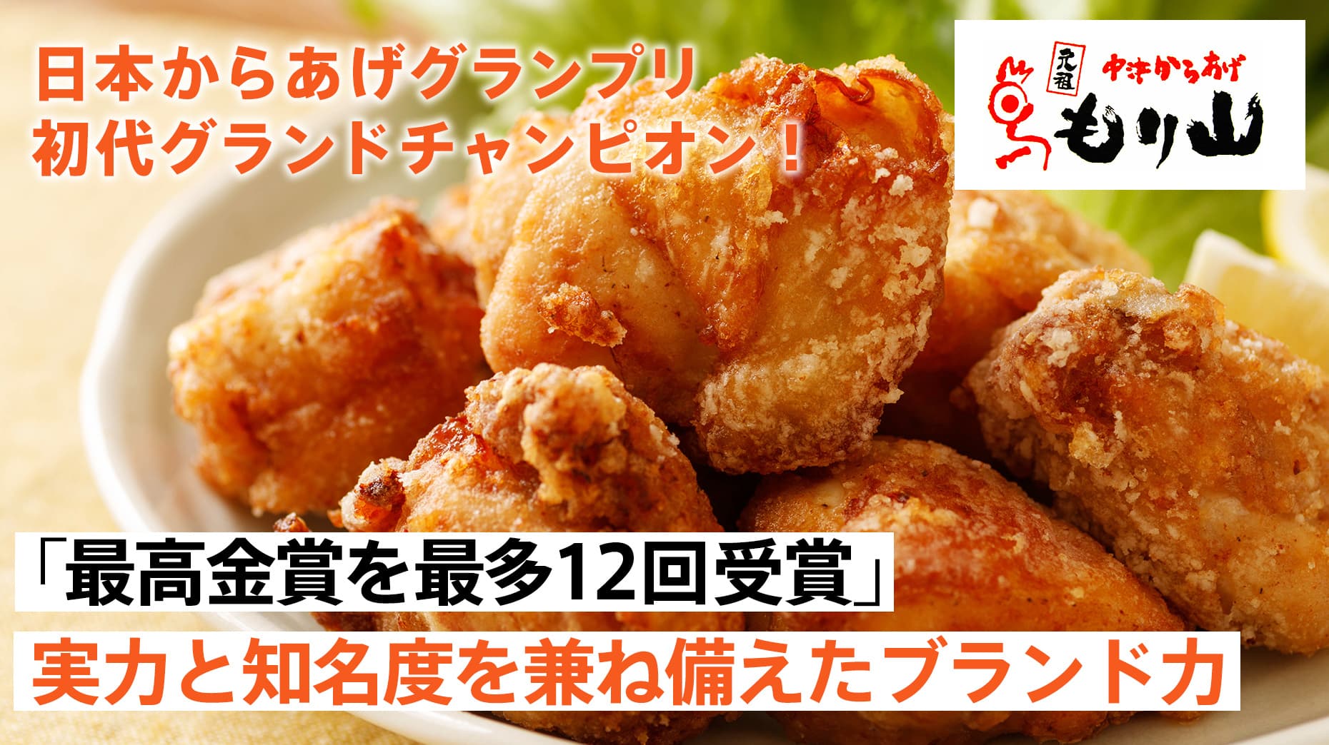 ■日本で1番になった自他ともに認めるこだわりのから揚げ 「元祖中津からあげ もり山」のから揚げは、日本で一番のから揚げを決める「からあげグランプリ」でグランドチャンピオンに輝いた理由は、3つのこだわりを貫くこと。 ------------------------------------------------------------------------------------------------------- ①秘伝のにんにくタレ 天然素材にこだわり、数十種類の調味料と自家栽培の国産ニンニクを使用したタレは、ニンニク独自の後味を残さずに食べやすく、飽きの来ない味に仕上げています。 ②100%国内生産のとり肉 とり肉は鮮度と国内生産のものを徹底して選んでいます。 臭みがなく冷めてもジューシーで美味しく食べてもらえるようこだわっています。 ③揚げ油 タレの旨みを含んだ油は、毎日つぎ足すことで、どこにもない「元祖中津からあげ もり山」の味を提供しています。 ------------------------------------------------------------------------------------------------------- 商品力だけでなく、きちんと味の再現性まで考えた研修も用意されていることも、全国で「元祖中津からあげ もり山」が愛される理由のひとつです。 ■15種以上の豊富な商品ラインナップ 「元祖中津からあげ もり山」では、テイクアウトやデリバリーといった様々な経営スタイルに併せて、15種類以上の商品ラインナップから選んで販売することが可能。 また、2週間の研修を設け、仕込みから揚げ方までしっかり指導してもらえるため、未経験の方でも味を再現することが可能となっています。 【受賞歴】 2010年 日本唐揚げグランプリ 塩だれ部門 最高金賞受賞 2011 年 日本唐揚げグランプリ 塩だれ部門 最高金賞受賞 2012 年 日本唐揚げグランプリ 塩だれ部門 最高金賞受賞 2013 年 日本唐揚げグランプリ 塩だれ部門 最高金賞受賞 2014 年 日本唐揚げグランプリ 塩だれ部門 最高金賞受賞 2014 年 5 年連続最高金賞 過去最多受賞達成 日本唐揚げ GP 受賞歴 2015 金賞 2016 最高金賞 2017 金賞 2018~2021 最高金賞 【メディア出演歴】 2020 年 12 月 17 日 秘密のケンミンショー 出演 2021 年 1 月 21 日 キスマイ宮田の大分巡り 出演 2021 年 3 月 22 日 坂上 指原のつぶれないお店 出演 2021 年 4 月 14 日 NEWS ZERO 紹介 2021 年 4 月 15 日 めざましテレビ 紹介 2021 年 8 月 11 日 中居正広の金曜日のスマイルたちへ|TBS テレビ 特集
