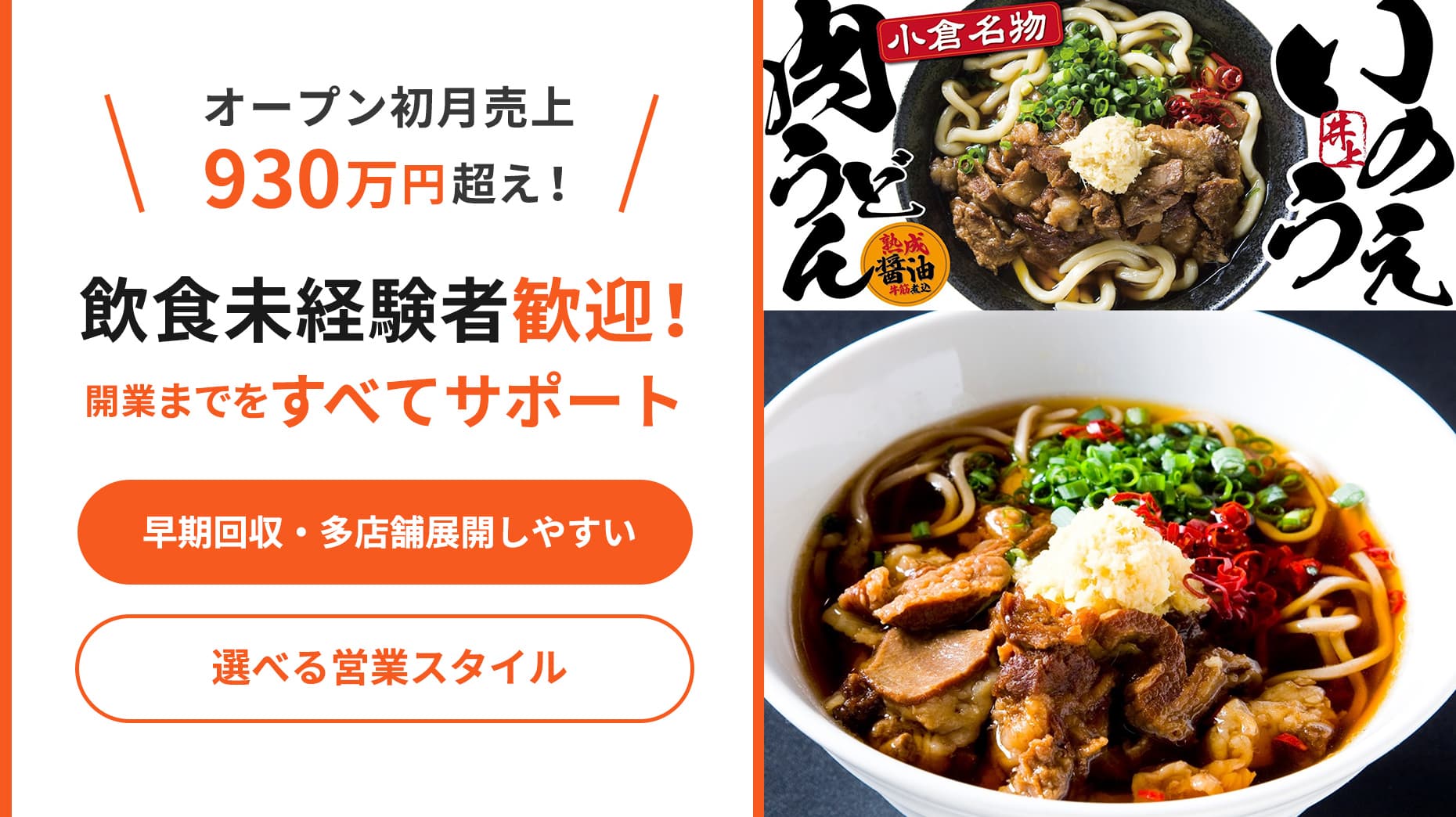 【Food'sRoute限定加盟金半額キャンペーン中】オープン初月売上930万円超え! 選べる販売スタイルと短時間の集中営業で高収益を図る「肉うどん」のライセンス事業