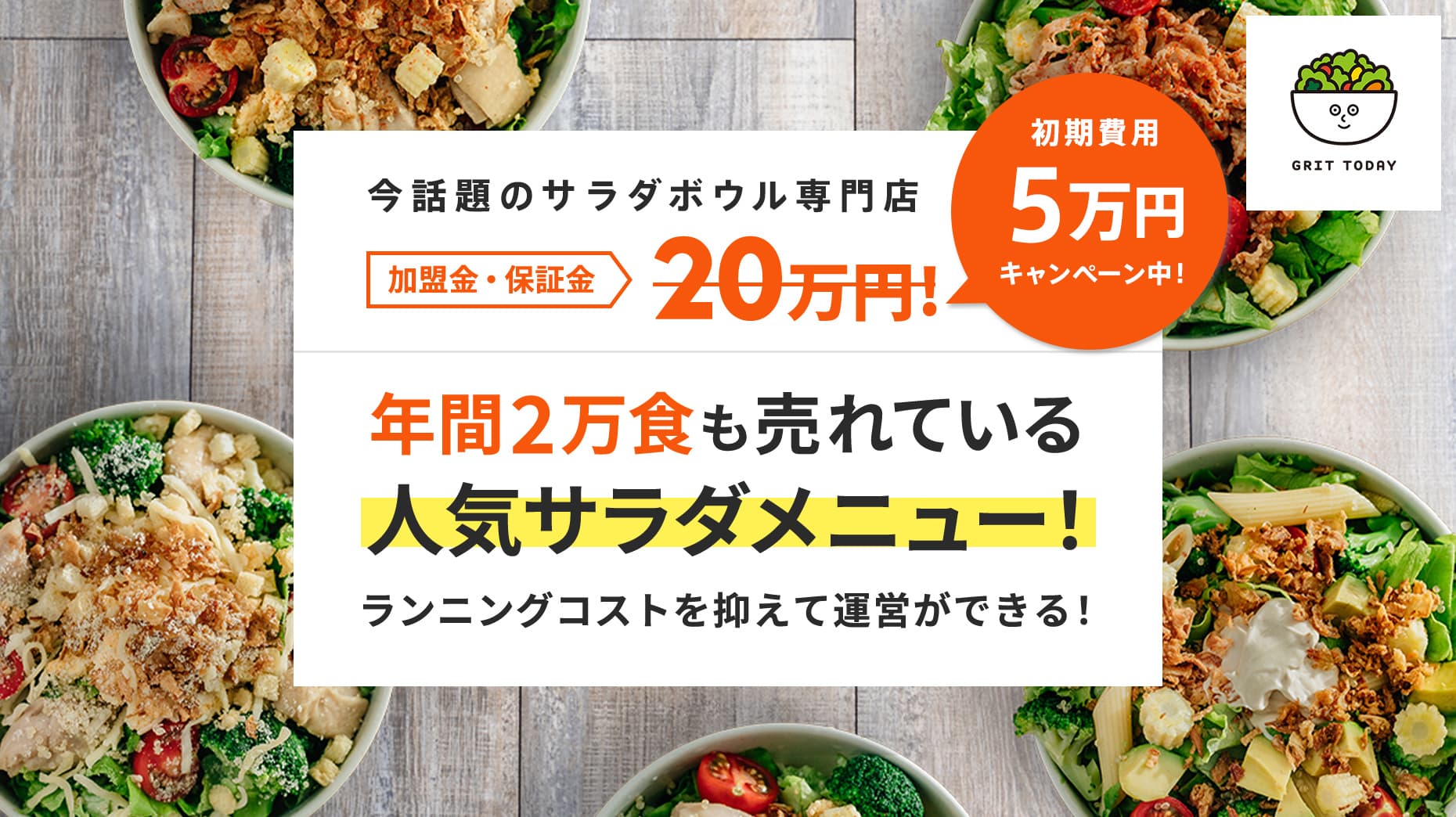 サラダ激戦区の恵比寿で勝ち抜き、年間2万食以上の販売実績・年商3,000万円以上!圧倒的な集客力と、お客様にとっても毎日食べても飽きない人気のサラダボウル専門店「GRIT TODAY(グリットトゥディ)」 新鮮でこだわり抜いたサラダメニューを提供し、健康面・食生活の改善をサポートすることで人気を博し、昨今の健康志向を始めとした様々なニーズに応えられるブランドとして、リピート率は65%以上と非常に高いところも特徴です。 運営元の株式会社グッドフードデザインは、飲食店の経営支援に特化したブランドシェアリング専門で行っており、今の飲食店を営業しながらデリバリー・テイクアウトのお店を開業できるため、売上の最大化を実現できる画期的なフランチャイズとなっています。 【こんな方にオススメ!】 ・来店数の少ない時間を活かしたい ・食材ロスに悩んでいる ・顧客単価をあげたい ・デリバリー店舗を始めたいけど、デリバリー向けメニューがない ・デリバリーの売上が伸び悩んでいる ・コストを抑えて売上をアップさせたい