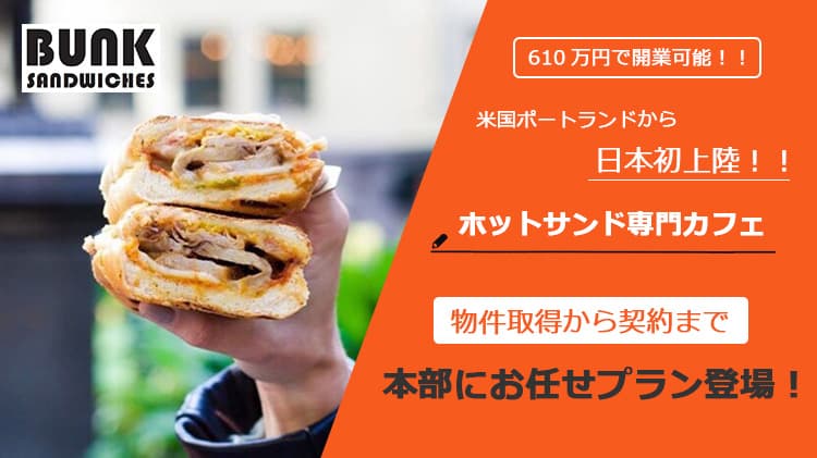 アメリカ・ポートランドで生まれた「バンクサンドイッチ」。 全米サンドイッチコンテストで入賞した看板商品「ポークベリーキュバーノ」を中心とした サンドイッチブランドで、現地では『お酒×ホットサンド』の組合せでBUNK BAR、BUNK BEERHALLの店舗に加え、イベント出店等を展開しています。 この度、飲食店を複数業態運営しているダイニングインターナショナル株式会社が、 日本のマスターライセンス権を取得し、国内では『カフェ×ホットサンド』として展開します。 稼働1年目は、関東圏を中心に店舗を8店舗に拡大し、 さらに、出店スピードを加速させるべく、ライセンス加盟パートナーを全国で募集致します。 コロナの影響を受けながらも、なぜ1年で8店舗の出店ができたのか? これまでの出店パターンや、商品戦略などを説明会でご案内いたします。