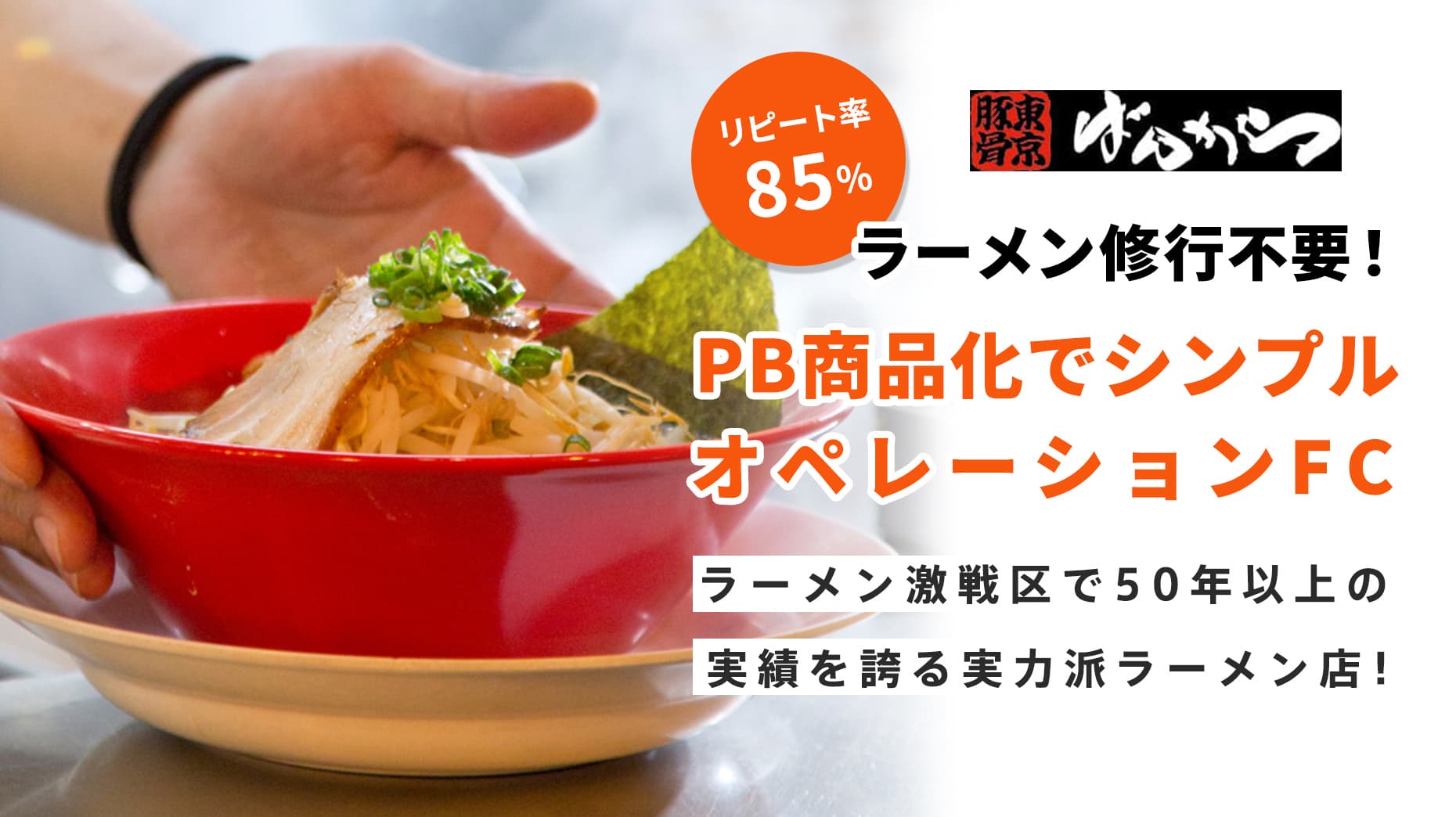 ラーメン激戦区で50年以上の実績を積んだ実力派ラーメン店。 くるまやラーメンをはじめとして全国に600店舗以上を展開してきた圧倒的ノウハウ。 誰が作っても美味いラーメンが作れる仕組み、独自の集客・接客方法、他店が真似できないラーメンへのこだわりなどがあります。 立地によって売上が左右されると言われているラーメン店ですが、東京豚骨拉麺ばんからでは成功できる立地選定や優良物件の紹介を受けられるため、安心して開業することができます。 また、ばんからは85%という驚異のリピート率を誇り、東京豚骨拉麺ばんからの商品力を高さが伺えます。 東京豚骨拉麺ばんからでは、ラーメンの質は落とさずPB商品化によるシンプルな調理オペレーションを徹底し、味の再現性を高めることで、長期のラーメン修行をせずとも誰でも始められるFCシステムを構築しています。