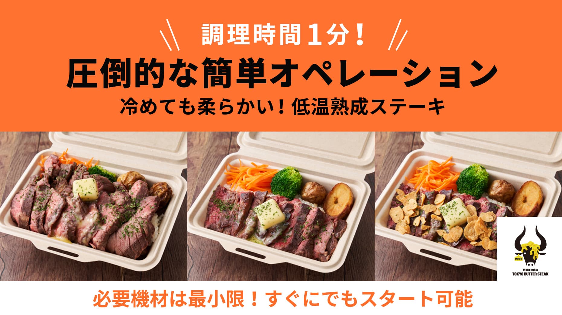 ■お肉が美味しい居酒屋さんが開発した「独自製法で仕上げた特別なステーキ」 デリバリーで提供される従来のステーキは、時間が経つと固くなりジューシーさが失われてしまうイメージがありますが、TOKYO BUTTER STEAKでは開発に開発を重ね、他とは圧倒的に食感が違う「しっとり柔らかい低音熟成ステーキ肉」を開発しました。独自製法で時間が経っても「柔らかくてジューシー」な仕上がりになっているので、デリバリーでも美味しいステーキを提供することができます。 基本商品のベースは5商品で「並」「大盛」「特盛」の3つのサイズバリエーションで展開しており、スープを加えて計16商品の取り扱いとなります。 <基本メニュー> ・バターステーキ ・ガーリックバターステーキ ・青唐辛子バターステーキ ・燻製バターステーキ ・低温熟成ステーキ 低温熟成済みのステーキ肉が納品されるので、店舗で焼き目をつけるだけで提供できるので、調理時間はたったの1分です。機材も基本的には既に店舗にあるものでまかなうことが可能です!
