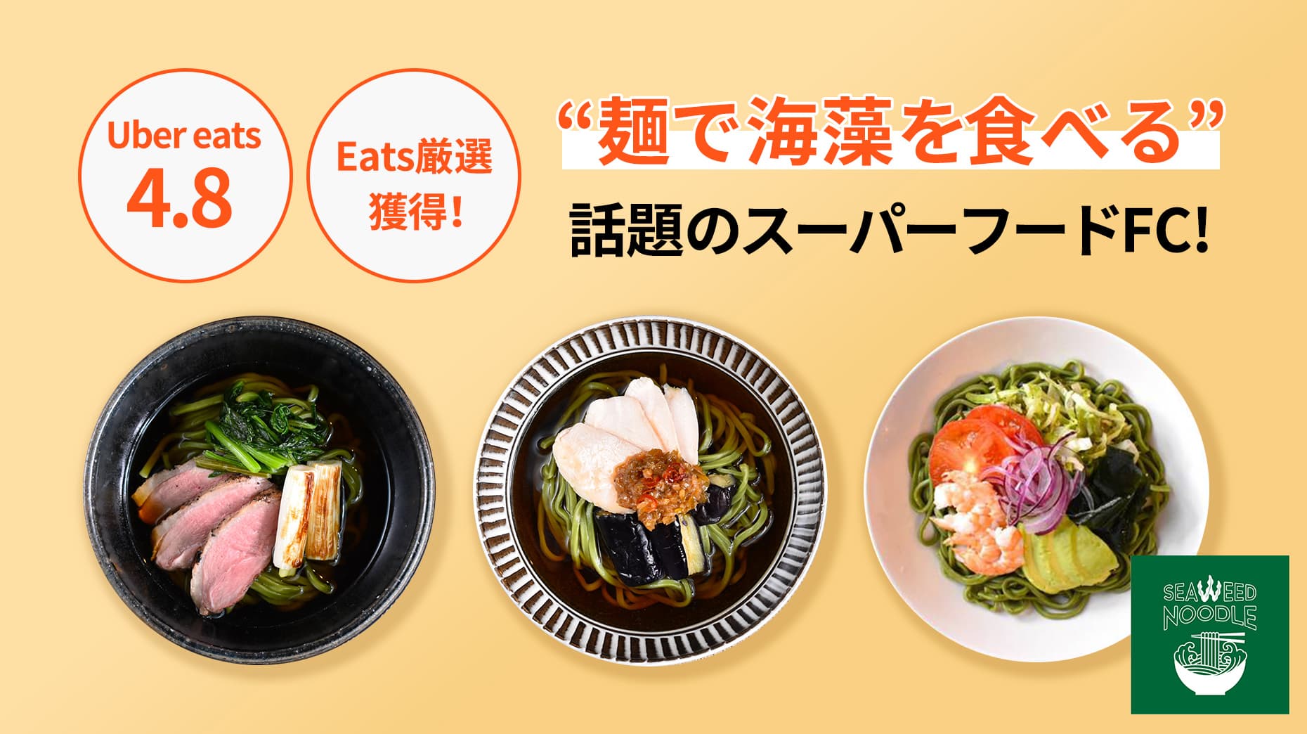 「麺を食べながら海藻を食美味しく食べて健康になってほしい!」 そんな想いが込められた「わかめ麺」は、約60年をかけて3代がかりで開発された麺です。粉末ではなく「ペースト製法」で麺に練りこむことで「つるつるモチモチ」の新食感麺になっているので、世代・性別を問わずにアプローチでき、幅広い客層を獲得できることが期待できます! また、通常の麺よりも耐久性に優れているので、本来テイクアウトやデリバリーには不向きだと言われていた麺料理でも、様々なシーンで活用が可能になっています。デリバリーサービス「UberEats」では、南青山店で「4.8」の高評価を獲得しており、「Eats厳選(全項目高評価をクリアした店舗にだけ付与)」となった実績もあるので、競争が激しいデリバリーサービスの中でも他店に差をつけられること間違いありません。
