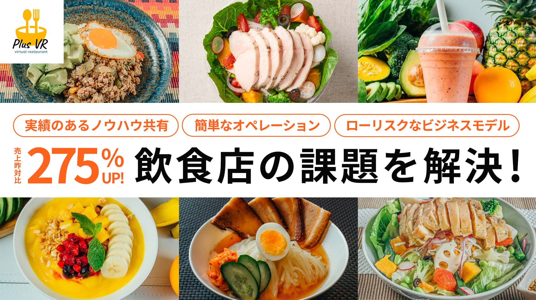 ■既存店舗をそのまま続けられる「簡単オペレーション」で売上UP! 成長中のフードデリバリー市場に参入するにあたって、既存店舗の売上UPのためにデリバリーを導入するお店が非常に多いです。 ただ、デリバリー用に新たに調理スタッフを準備するのは大変で、デリバリーを始めたが故にお店の運営に影響が出てしまっては意味がありません。 +VRは、簡単オペレーションになっているだけでなく、調理未経験の方でもたった2日間の研修で対応ができるようになるための徹底したマニュアルもご用意しています。研修は本部の担当者が行い、調理と食材仕入れについてレクチャーを行うので、安心して営業開始することができます。 ■リピート率40%以上の実績があるノウハウの共有 +VRは開業前後で充実したサポートを提供しています。 各種デリバリーサービスの登録やプラットフォームの掲載整備の代行だけでなく、リピート率40%以上を実現したノウハウの共有や、お客様の声やメニューの売れ行きなどデータを包み隠さず共有しています。開業後も、データやお客様の声を元に定期的に売上を伸ばすためのサポートを実施しており、加盟店様同士が連携・交流ができるようなコミュニティーの場も用意されています。 コミュニティーを活用することで、各々の加盟店が持ってる情報や進捗を共有し、店舗の売上のプラスαに繋げることができます。