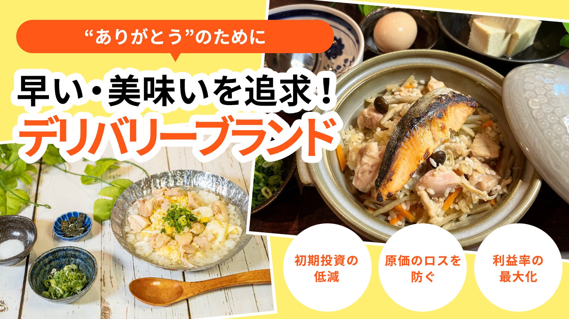 ■「他にはない店舗作り」を実現できる Delivery Moleでは、「雑炊」や「出汁とろろ丼」、「釜飯」などご飯物を中心としてブランドをご用意しています。指定食材などがほとんどないため、食材は各店舗で仕入れたり、すでにある食材を利用することができ、食材ロスや原価を削減することができます。また、既存店舗で提供しているメニューをサイドメニューとして使用することも可能なので、店舗の独自性を出すことで「他にはない店舗作り」が実現できます! <ブランド(一部メニュー)の一例> 【ぞうすいマニア 鶏キング】 梅鶏雑炊、牡蠣雑炊、鮭雑炊、肉味噌 + 鶏雑炊 など 【出汁とろろ丼専門店〜ねばとろ次郎丸〜】 豚しゃぶ梅とろろ丼、豚しゃぶ山葵とろろ丼、豚しゃぶ明太とろろ丼 など 【健康応援食〜釜飯日和〜】