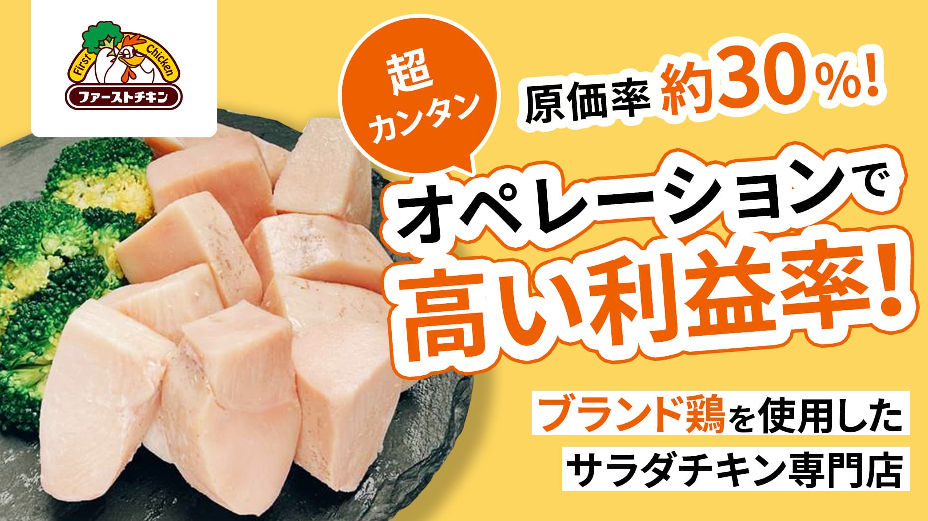 「First Chicken(ファーストチキン)」は、国産鶏肉の最高級ブランド「信玄鶏」を使用し、フレンチの名店「HOTEL DE MIKUNI」のシェフが9年間かけて開発した調理方法を用いた「低糖質・高タンパク・低脂質」の健康食ブランドです。従来、低糖質・低脂質&高タンパクの料理は、加熱によるタンパク質の凝固で全体がパサつくことが大きな課題でしたが、ファーストチキンでは素材と調理法を追求し、うま味を閉じ込めた「しっとり食感」で美味しい健康食を作ることを実現しました。商品のお客様満足度も非常に高く、大手デリバリープラットフォームにおいて、5段階評価中「4.9」と最高評価を獲得しています。そんなファーストチキンが、2023年からFC募集を開始しました!!初期フェーズの特別キャンペーンとして、【先着5店舗限定】で「加盟金ゼロ・ロイヤリティゼロ」でのご案内が可能です! <特別キャンペーン> ★加盟金:10万円 ⇨【0円】 ★ロイヤリティ:5% ⇨【0%】 ファーストチキンを運用するにあたっては、鶏胸肉が下処理や調味済みの状態で個包装の真空パックにされて納品されるので、低温で5分調理するだけの超簡単オペレーションになっており、料理未経験の方でも問題なく運用することが可能です。また、原価率も30%に抑えられているので、高い利益率を実現しています。
