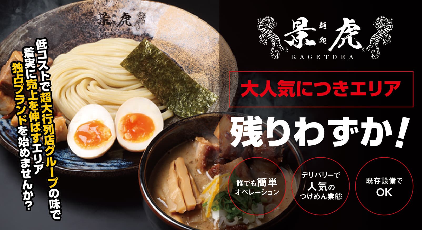 麺処景虎を実店舗として運営してます。 実際のラーメン屋で営業してますので、導入しやすかった。 また、オペレーションも簡易的で(スープも決まった量を入れるだけで完成) 飲食店をやられている方でラーメン・つけ麺を取り入れたいと思っている方などにはかなりオススメです。 味もデリバリーとしてのクオリティは高く、リピーターが多いのでデリバリーとかなりマッチしてます。 後はUberなどデリバリーに精通している本部の方がいらっしゃるので、その本部だからこそできる打ち合わせなども助かってます。 これからもよろしくお願いします。