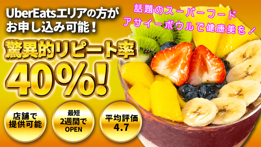 ハワイを感じるフレッシュフルーツたっぷりのアサイーボウル専門店!cafeやデザートを扱ってる店舗様、午前中から営業している店舗様は特に相性が良いです!※UberEatsのエリア内で既存店舗(営業許可書)をお持ちの方が導入可能!