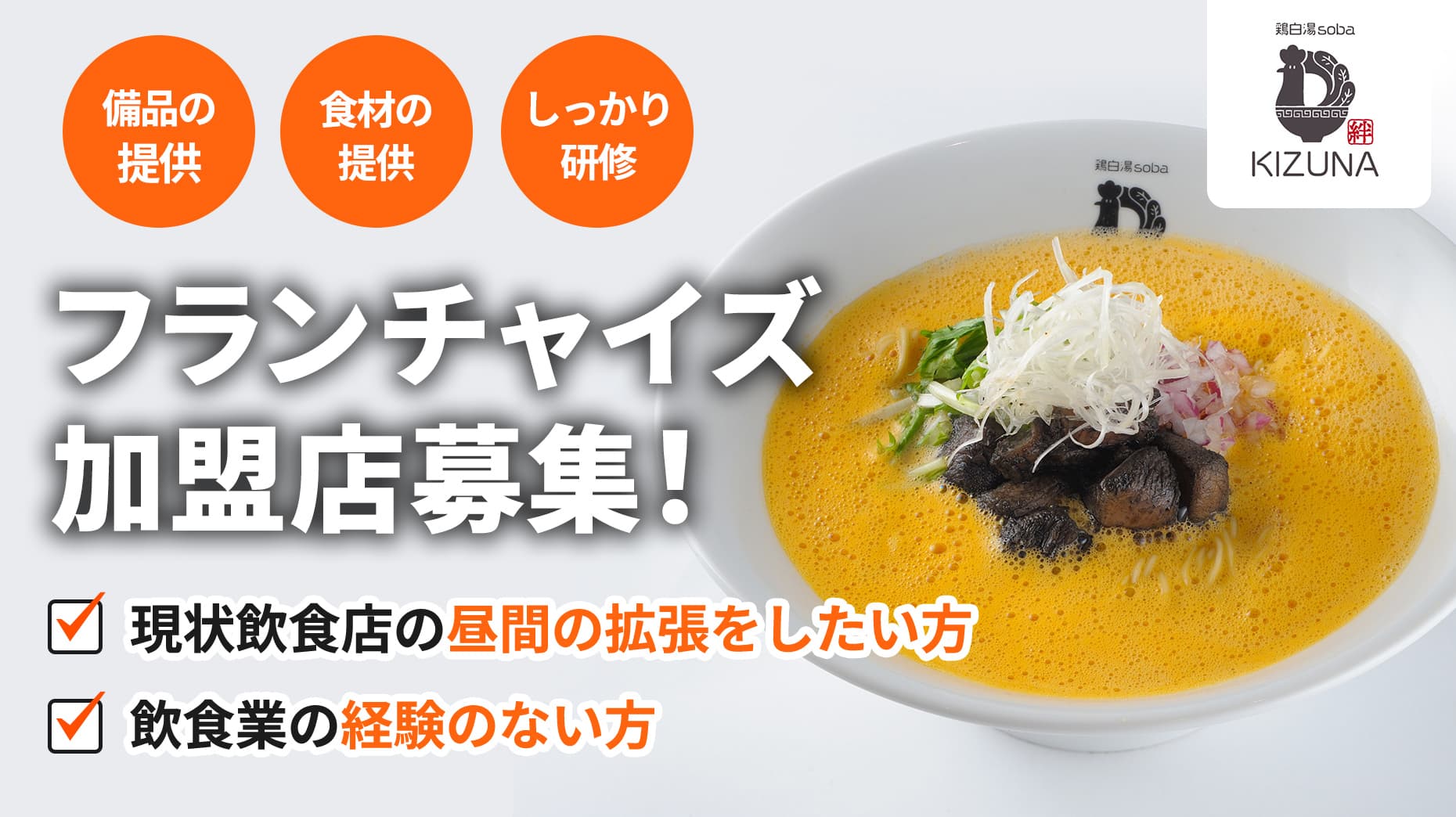 \ こんな方にオススメです / ✓現状飲食店の昼間の拡張をしたい方 ✓飲食業の経験のない方 ✓とにかく売り上げをあげたい方 ~「鶏白湯専門店DURA麺TE」の開業ストーリー~ 無担保無保証のコロナ融資の支払いの時期が近づく中、返済できない現状の中で悩み抜き「どう売り上げをあげるか」の答えとして焼鳥屋が考え抜いた"究極の鶏白湯ラーメン"を開発しました。 同じ悩みを抱える飲食店様に何か貢献できればと考え、焼き鳥店の昼営業としてスタートした「鶏白湯専門店DURA麺TE」のフランチャイズ店「鶏白湯soba KIZUNA」の募集を開始します! ・商品開発にかかる時間やコスト ・レギュレーションの構築 ・設備や備品の検討 ・マーケティングや事業計画 開業するにあたって必要となる部分は全てご提供! 一般的に開業には1,500万円ほどのコストがかかりますが、加盟店様には【88万円(税別)】で開業して頂く事が可能です。(※昼営業プランの場合) 試行錯誤を繰り返しながら完成された商品を提供できるので、顧客満足度高×安定利益が見込めます。 ■"各都道府県2店舗の商圏保証"付き! 「どんどん加盟店が増えて売り上げがあがらなかった・・」 「近くの立地が良い店舗にお客さんを取られてしまった・・・」 など、加盟して頂いてから起こりうるリスクが無いよう、各都道府県2店舗限定の商圏保証を付けております。 競合が少ない環境で独走して頂けます。 ■デリバリーブランド「マフィアチキン」同時開始可能! チキン・キンパ・スンドゥブなど人気の韓国料理を主軸としたデリバリーブランド「マフィアチキン」も加盟店様には【無料】で同時開始が可能です! 韓国料理ブームがまだまだ続く中、今からでも売上の主力として活躍が期待できます。デリバリーの売り上げだけで十分「鶏白湯soba KIZUNA」のロイヤリティが賄えるので更にリスク少なく加盟して頂く事が出来るようなサービスのご提供を決めました。 ・既存飲食店の売り上げ拡大に悩んでいる ・お客様に喜ばれる商品がもっと欲しい! ・場所の有効活用をしたい! ・飲食店にチャレンジしてみたい! 色々なお悩みや想いをお持ちの皆さまへ、一緒に最適な"answer"を見つけ、「しっかり利益を出して喜んで頂きたい」それが弊社から加盟店様への想いです。是非一緒に売上拡大を目指しませんか?