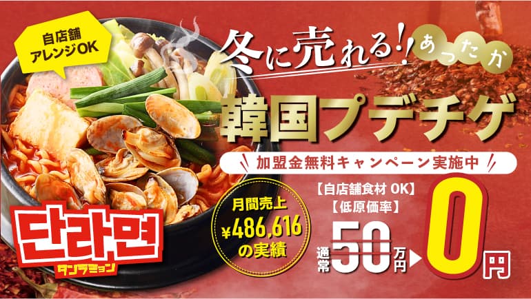 【ブランドについて】 ソーセージやスパム、もっちりツルツルのインスタント麺を辛スープで煮込んだ 韓国の大衆的鍋料理です! 【注目ポイント】 ・原価率30%以下 ・居酒屋業態推奨、店内提供OK! ・食材の縛りがなく、店舗様にある食材でOK! 【特徴】 寒い時期にぴったりの業態です。冬季限定メニューとしての提供もおススメです! ■キッチンオペレーション 具材を事前に準備し煮込むだけ!食材の種類が豊富にある店舗様にオススメです。 鍋とコンロがあれば7分で調理可能です。 ●仕込み工数:かんたんな仕込みあり ●調理時間:7分 ●調理食材:麺・タレ・チヂミなど ●調理設備:ガスコンロ・鍋 ●調理方法:煮る・盛り付け \毎月10店舗様限定!加盟金50万円→0円(特別キャンペーン)/ 【AETA WORLDについて】 100種類以上のブランドから、お店の規模や業態に合わせて自由に組み合わせて運用が出来る日本最大のバーチャルレストランサービスです。 導入検討にあたって《5大ポイント》をご紹介! ❶導入拠点数業界No.1! ❷お店の状況に合わせてブランド交換やブランド数の増減が自由自在 ❸Uber EatsやWolt、出前館などの複数の注文タブレットを1つのタブレットで一元管理 ❹運用開始後も専任のサポート担当が運用フォロー ❺店舗オリジナルメニューとして提供可能(一部ブランドを除く)