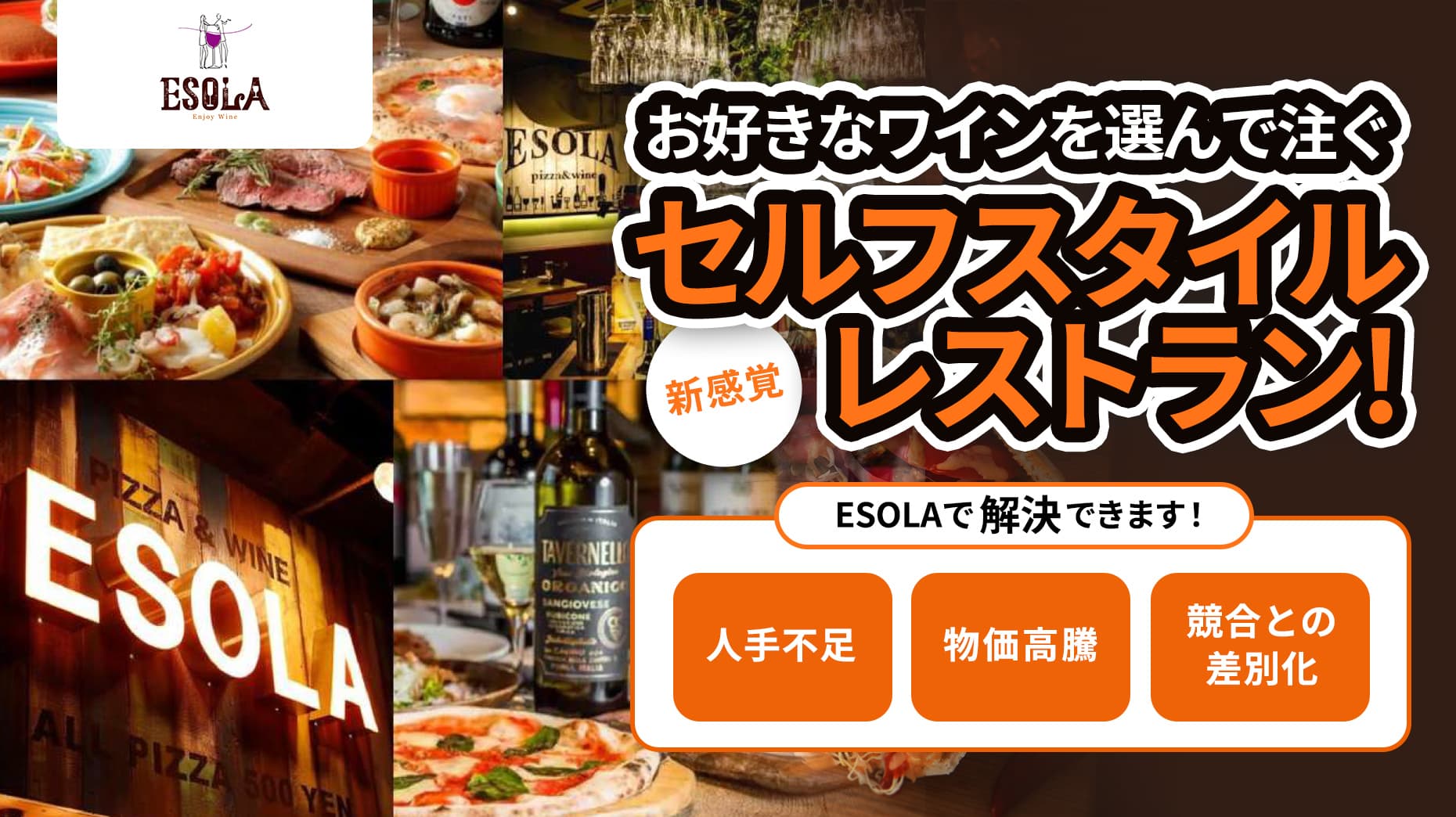 ■通いやすい価格・店構え 「すべての世代に愛される、イタリアンのカジュアルダイニング」をコンセプトに運営しているESOLA。 レストランを選ぶ基準は価格はもちろん、お店の雰囲気やサービスだと言われています。 高級なイメージを持っている人も多いイタリアンですがESOLAは前菜¥490~、メイン料理も¥1,000代での提供をしています。 友人や知人、恋人同士はもちろんファミリー層のお客様も気軽に立ち寄れる店である事が、継続的な利益獲得に繋がります。 少人数での利用はもちろん、コース料理も¥3,000~の設定になっているので大人数の利用も多く見込めるのが特徴です。 ■セルフスタイルがお客様とのwin-winを作る セルフスタイルのビュッフェ形式でお好みのワインをお召し上がりいただいているのも特徴。 飲食店で課題となっている人員不足の解消に効果があるだけではなく、 お客様にとっても都度店員を呼ぶ手間が無く好評頂いています。 100種類のワインを取り揃えているので、何度でも通っていただける理由にもなっています。 ■ライブ感あるオープンキッチン カジュアルな価格帯とはいえ、フォーマルなシーンにも利用頂けるお店の雰囲気である事も重要。 オープンキッチンにより開放感溢れ店内に活気を持たせている事も人気。 入店しやすいけど特別な時間を味わえる事が付加価値となり、店内での時間をお楽しみいただけるよう努力しております。 費用を掛ける部分は他飲食店との差別化にし、ベースは居抜き物件での立ち上げをする事で費用を抑える事が可能です。 ■注目のポイント ・世界のワイン約100種類 世界のワイン約100種類(赤・白・泡)飲み放題は2時間1,990円~! 自家製サングリアやサワー・ハイボールなど全部まとめて"時間無制限飲み放題"もございます。 お洒落でスタイリッシュなワインバル空間。小人数様から大人数様まで多彩なレイアウトでご用意が可能です。 記念日やサプライズはもちろん、貸切や結婚式の二次会などもお気軽にご相談ください! ・自家製窯焼きPIZZA 毎日店舗で生地から作るこだわりの自家製窯焼きピッツァは1枚690円~30種類をご用意。ワインに合わせたお肉料理・パスタ・本格イタリアンメニューも充実しています。 毎日店内で生地から手作りしている「自家製窯焼きPIZZA」は約30種類!基本のトマトソースはもちろん、ホワイトソースやバジルソースなど種類豊富にご用意いたしております。さらにトッピングだけでも15種類以上をご用意!カスタマイズして自分だけのオリジナルPIZZAも作れちゃいます。 ・スタイリッシュなバル空間 世界各国のワインを取り揃えたESOLAの“ワインビュッフェ”は赤・白・スパークリングなど、どれでも自由に飲み放題! ワインシャンデリアよりお好きなグラスを取って、並べてあるワインからお好みのものを自由に開けて注ぐセルフスタイル♪ワインだけでなくサングリアなどもご用意していますので、ワイン初心者の方も安心して楽しんでいただけます。