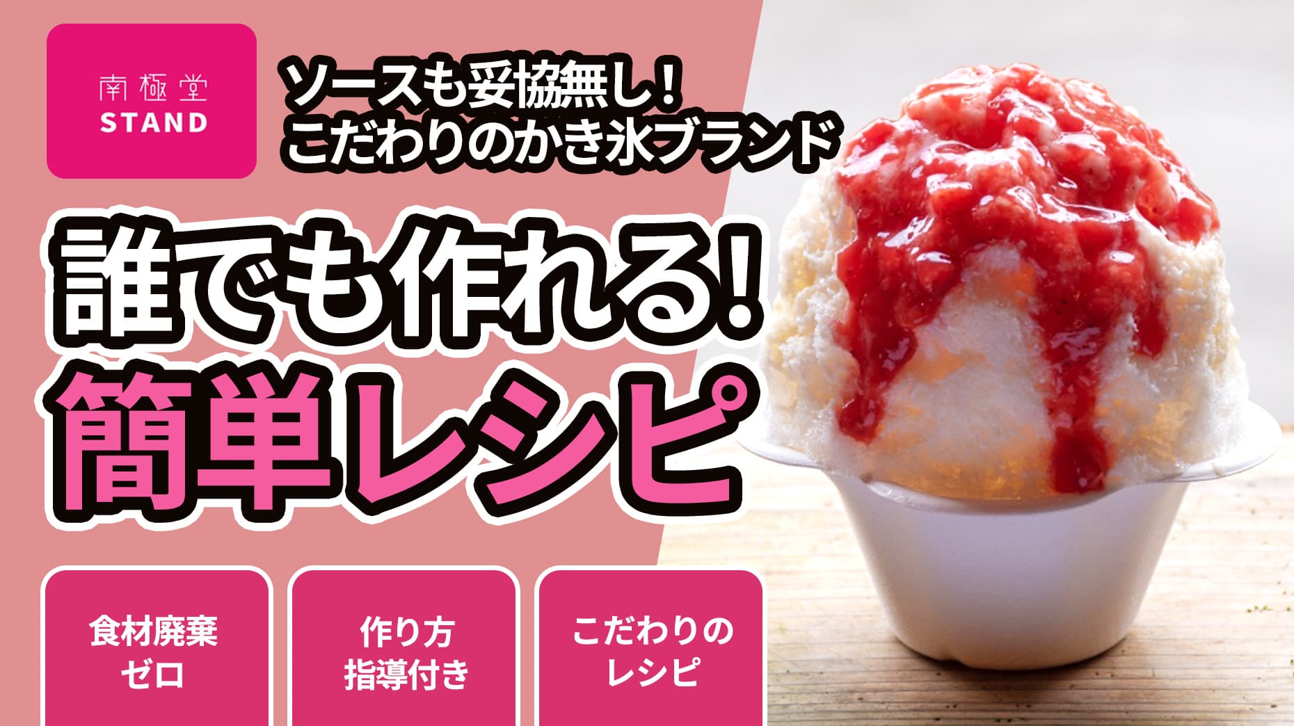 ■愛されるお店で居続ける 昔からイベント出店や自宅などで誰しもが食べたことのあるかき氷。 「かき氷南極堂」は2017年に開業。 当時は地元京王線各駅停車しか止まらない"南平"の駅からのスタートでした。 地元の仲間たちにも協力してもらい店舗をスタート。 コロナ前は2時間待ちという予想以上の反響をいただきました。 その後、台帳記入制を取り入れましたが、それでも行列ができてしまい予約制システムにかえ営業していました。 去年より、フランチャイズ化を想定しテイクアウト専門ブランド「南極堂STAND」を立ち上げし、 現在はこの味を全国誰でも簡単にできる様なオペレーションにチェンジして仲間を募集しています。 ■こだわり続けた商品 仕込みゼロ!解凍するだけ! 手の込んだソースを本部から仕入れするだけで済むのは飲食店として最大のメリット!! ≪ふわふわかき氷≫ 南極堂STANDは「ふわふわ」を大切にしています。 未経験の方でももちろん削り方を伝授いたしますのでご安心ください。 テイクアウトでもお店で食べる時のインパクトを再現できるように日々研究しています。 ≪ミルクソース≫ 商品のベースとなる【命】のミルクソースは、北海道産の厳選素材を使用。 オリジナルレシピの為、他では味わえない美味しさです。 何年も改善を重ね完成したミルクソースは多くのリピーター様を獲得するキッカケともなりました。 ≪ソース≫ お客様にお選びいただけるソースも、北海道産の素材を中心にてんさい糖やフルーツ、京都の石臼挽き抹茶など、厳選素材を使用しています。 美味しいと身体にやさしいを同時に叶える事で、他とは違う価値を・・・・。