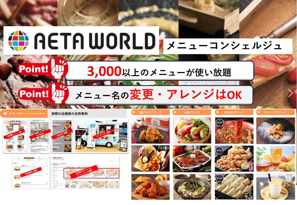 ブランド開発は今までの加盟店様からのお声を元に日々改良、アップデートさせており、コンサルタントが加盟店様の課題をヒアリングし、最適なブランド提案を行わせて頂きます。 ーーーーーーーーーーーーーーーーーーーーーーーーーーーーーーーーーーーーーーーーーーーー 【AETAWORLDブランドの強み】 ①最新ブランドを常にアップデート ・AETAWORLDは毎月2ブランド以上の新ブランドがリリース。2025年2月末時点での保有ブランドは90以上。 メニュー数は3,000メニュー以上。 ②店舗様の利用シーンに合わせたブランド開発 ・「SNSでの流行ブランド」「食べログ評価3.5以上の有名店ブランド」「季節用ブランド」「海外ブランド」「定番ブランド」「テイクアウトブランド」の大カテゴリから業態別にスイーツ・洋食・和食・丼ぶり・中華・ラーメン・焼肉・海鮮など常にお店の利用シーンに合わせたブランド開発を行っております。「店内」と「デリバリー」で活用出来ます。メニュー開発人員としてAETAWORLDをご活用いただければ幸いです。 ③店舗様の課題に合わせたブランド開発 店舗様の課題は様々です。既存の食材を使いたい。原価率を下げたい。客単価を上げたい。即提供できるブランドが欲しい。などなど、弊社は店舗様の課題解決できる様に大きく3つのパターン「3分以内に提供可能なブランド」「原価率25%以下のブランド」「お店の食材で出来るブランド」と店舗様の利用シーンに合わせたブランド開発を行っております。 ④味にこだわったブランド開発 ゴーストレストランだから美味しくないは言わせません。弊社のブランド開発人員は5名体制のユニットでブランド開発を行っており、国内兼グローバル総料理長のシェフ、櫻井の経歴は長年ミシュラン店である、ロブション、オテル・ドゥ・ミクニなどの出身です。妥協を許さない味へのこだわりは料理のプロからも一目置かれます。 ーーーーーーーーーーーーーーーーーーーーーーーーーーーーーーーーーーーーーーーーーーーー 2021年にリリースしたAETAWORLDは加盟店様の声を参考にバーチャルレストランだけではなく、デリバリーメニューを自店舗メニューとしても利用出来たり、有名店のメニューとコラボが出来たり、加盟店様の集客支援におけるトータルサービスとして、全社員一同「このサービスに出会って良かった」と思って頂けるサービスを目指しております。 ーーーーーーーーーーーーーーーーーーーーーーーーーーーーーーーーーーーーーーーーーーーー 【AETAWORLDサービスの強み】 ①信頼の証!導入実績店舗数日本NO1! 2015年より複合型バーチャルレストランを運用してきた弊社は今までに約6,000店舗以上の出店を日本全国へ行って参りました。過去からの積み上げてきたノウハウと膨大なデータを活用して、店舗様の売上の最大化をご支援致します。 ②売上を上げる為のフォロー体制 ブランド開発では最終的に仕上げるプロが必要です。一度は食べてみたいと思わせる、しずる感溢れるメニュー画像を撮る撮影部隊、お客様が「食べたい」と思わせるリーディングにて、カート追加率を分析するWebマーケティング部門、店舗様自身ではなかなか難易度が高い部分を弊社はチームとしてサポート致します。OPEN後は広告運用のプロ集団(AETAWORLDコンサルタント)が1店舗様に必ず1名は担当が付き、アドバイスを行っております。デリバリーの相談含め、お店の運用相談まで手厚くフォロー致します。 ③導入コスト・運営コストは業界最安値 2017年度からフランチャイズをスタートした弊社は過去の退店店舗様からのヒアリングを元に今回、最も店舗様にとって継続的にサービスを利用して頂ける最良プランをご用意しております。プラン価格にも絶対の自信。 ④加盟店様専用のブランドプラットフォーム 弊社の100以上ある全ブランドが閲覧できる加盟店様専用のブランドプラットフォームがご利用頂けます。ブランドプラットフォームでは全ブランドの閲覧はもちろん、動画マニュアルやメニュー表のダウンロード機能、など加盟店様の売上をバックアップ致します。 ⑤ブランドは無制限にて導入し放題 店内でのランチメニューの売上UPに、アイドルタイムの売上UPに、シーズンメニューの開発の代わりに。全3000メニュー以上がいつでも使い放題のサービスです。様々な角度から店舗様の集客支援を行います。