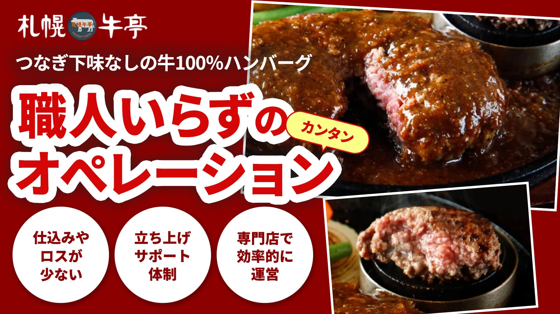 ■北海道から登場! 「札幌牛亭」はこだわりの牛100%のハンバーグ+オリジナルソースが自慢のハンバーグ専門店です。 1981年にステーキハウスとしての歴史がスタートした後、赤身肉の美味しさを伝える為ハンバーグの提供を開始してから一度食べたらやみつきになる味と満足感に多くのリピーターを獲得し続けています。 更にメディアへの掲載や口コミでファンの獲得も実現済◎ 現在では北海道に3店舗・関東に1店舗とまだまだ拡大のチャンスが多くあるブランドで参入のチャンスです! 長年守り抜かれて来た味は札幌のキッチンで一括作成し全国へ配送しているので、未経験からの参入でも味ブレによる顧客離れなし◎ 「高回転率が出来る店作り」、「プロの料理人がいらない業態」、「長期で営業できる立地選定」を実現するために運営本部がしっかりとサポートしていきます! \札幌牛亭の加盟はこんな方がオススメです/ ・既存店を持っているが、ランチタイムの営業ができていない。 ・夜のアルコール事業を辞めたい。 次のビジネスモデルを探している。 ・飲食業を始めたいが、経験がない。 ・職人頼りの飲食業は経営が難しそう。
