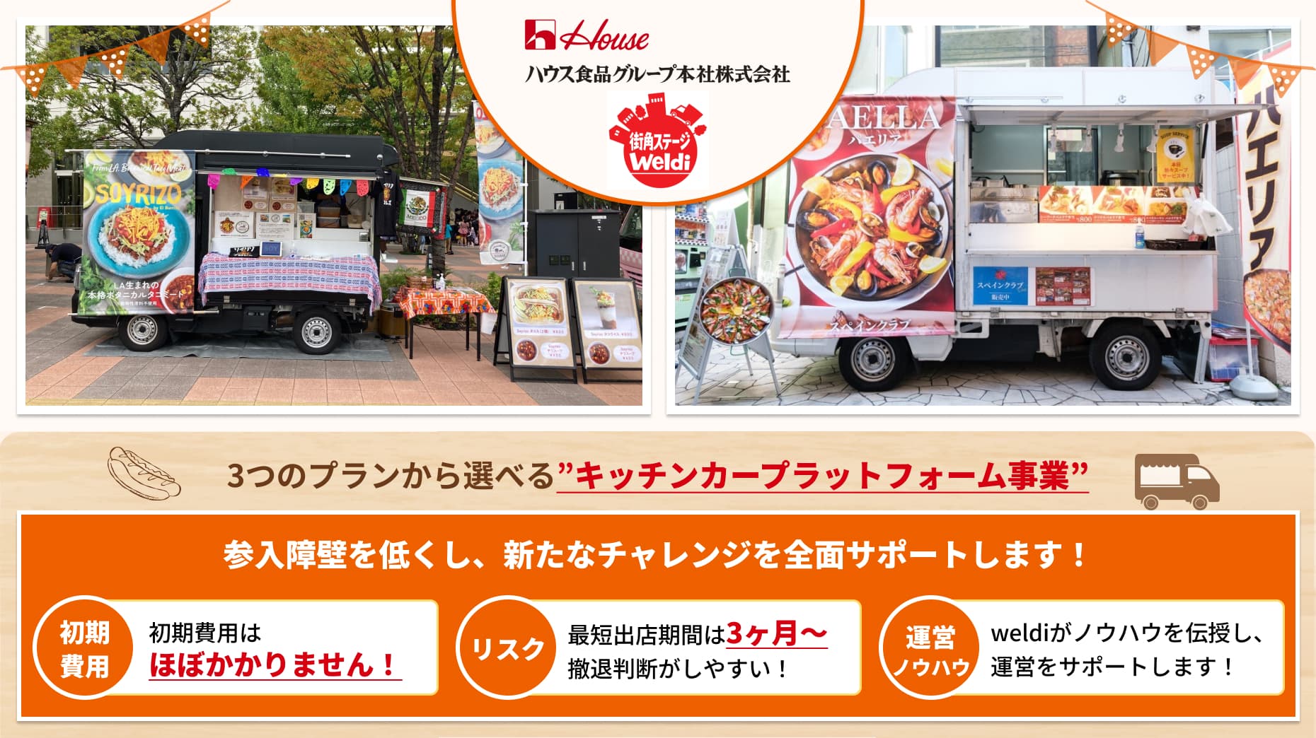 \オーナー様の夢を叶えるキッチンカープラットフォーム事業/ ✓キッチンカーに興味はあるものの何から始めれば・・・ ✓準備するものが多く、置く場所が無い・・・ ✓思うように売上が上がらなかったらどうしよう・・・ ✓副業としてキッチンカーを始めたいけど・・・ ✓お店の商品をイベントに出店したいけど車を買うのは・・・ 等、さまざまなご不安をお持ちの事と思います。"街角ステージweldi"ではそんなオーナー様のご不安を解消すべく、現状に合わせた3つのプランでご契約が可能。 ここまで参入障壁を低くしているのは、新たな飲食業界の主流となっている「キッチンカー」で食にかかわるすべての人に新しい価値を提供し続け、日本の飲食業界の活性化に貢献していくため。 やっぱりリスクが高いからやめておこう・・・と良い商品を世の中に出せないままにしない為に、キッチンカーのプラットフォーム事業を始めています。 2021年3月にハウス食品グループ本社株式会社が展開した"街角ステージweldi"は、すでに300件以上成約いただいておりますが、PR活動を積極化し更なる認知を目指しています。 今後も幅広い層にアプローチ可能な「キッチンカー」に、低リスクで参入してみませんか?