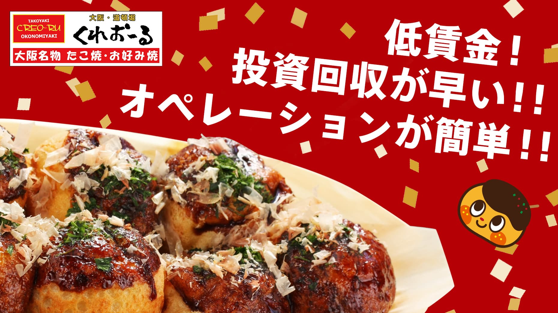 大阪名物のたこ焼・お好み焼・串かつを、一度に食べることができる「くれおーる」。特に大阪道頓堀名物たこ焼きは、TVの情報番組や動画サイトなどでも度々取り上げられ、高い評価を受けるほど絶品です。2坪から開業ができ、低リスクかつ早期投資回収が可能なフランチャイズビジネスとなっています。さらに少人数による簡単オペレーションが可能で、他の飲食店FCと比較しても低資金で開業が可能です。