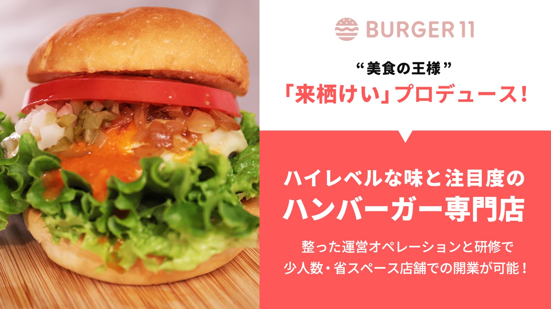 ■``食の王様`監修の圧倒的なブランディングと味に説得力があるグルメバーガー 監修の食の王様こと来栖けい氏は、1万件以上の飲食店を訪問し、自身が本当に美味しいと思った料理について記事の執筆を行う有名フードライターです。 実績を活かし、フレンチレストラン「Bon.nu(ボニュ)」・若手シェフをの育成を目的とした「エキュレ」を経営。 シンプル+オリジナリティという独自のスタイルで食べログ評価4.59と高い評価を獲得しています。 そんな来栖けい氏が完全監修したBURGER11では、シンプル( 自然体 ) をコンセプトに「素材」と「味」と「見た目」へ責任をもってメニュー開発を行い、味に説得力のあるグルメバーガーを完成させました。 味の要となるハンバーガーのパティは、つなぎが一切入っていない黒毛和牛70%以上の合挽肉を使用し、味付けは藻塩のみ。野菜も現場調理を行い、鮮度と味を重視する徹底っぷりです。 こだわり抜かれたハンバーガーは、セントラルキッチンで仕込むことで味を一定に保つことができるため、調理技術がなくても安心して提供することができます。